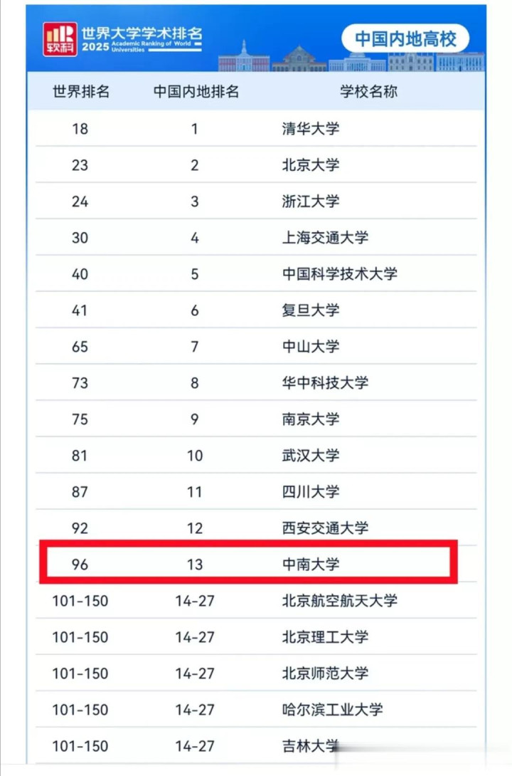 湖南的高校在软科实力排名中表现得又如何呢?我们发现,在榜单中,湖南省内大学领头羊中南大学位列96名,是湖南省内高校中排名最高的院校。
