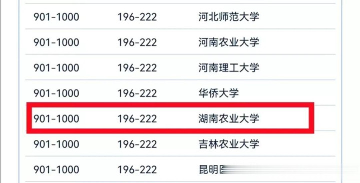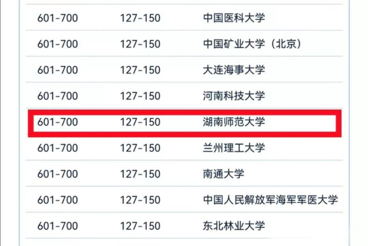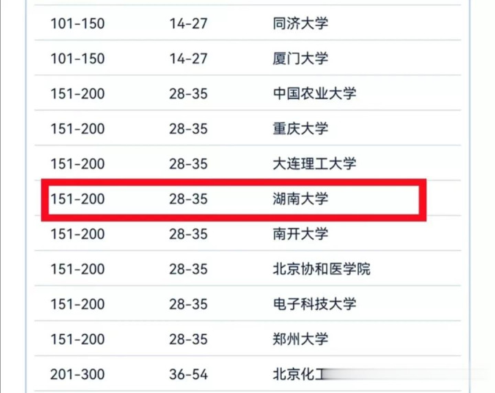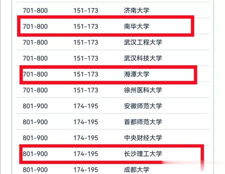 其他的湖南名校如湖南大学位列151—200名,湖南师范大学位列601—700名,南华大学、湘潭大学位列701—800名,长沙理工大学位列801—900名,湖南农业大学位列901—1000名。